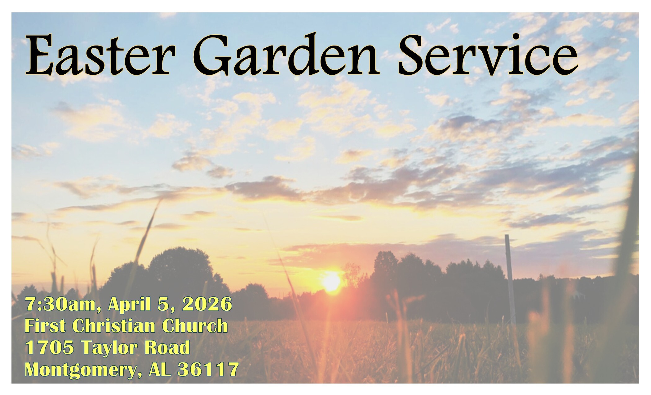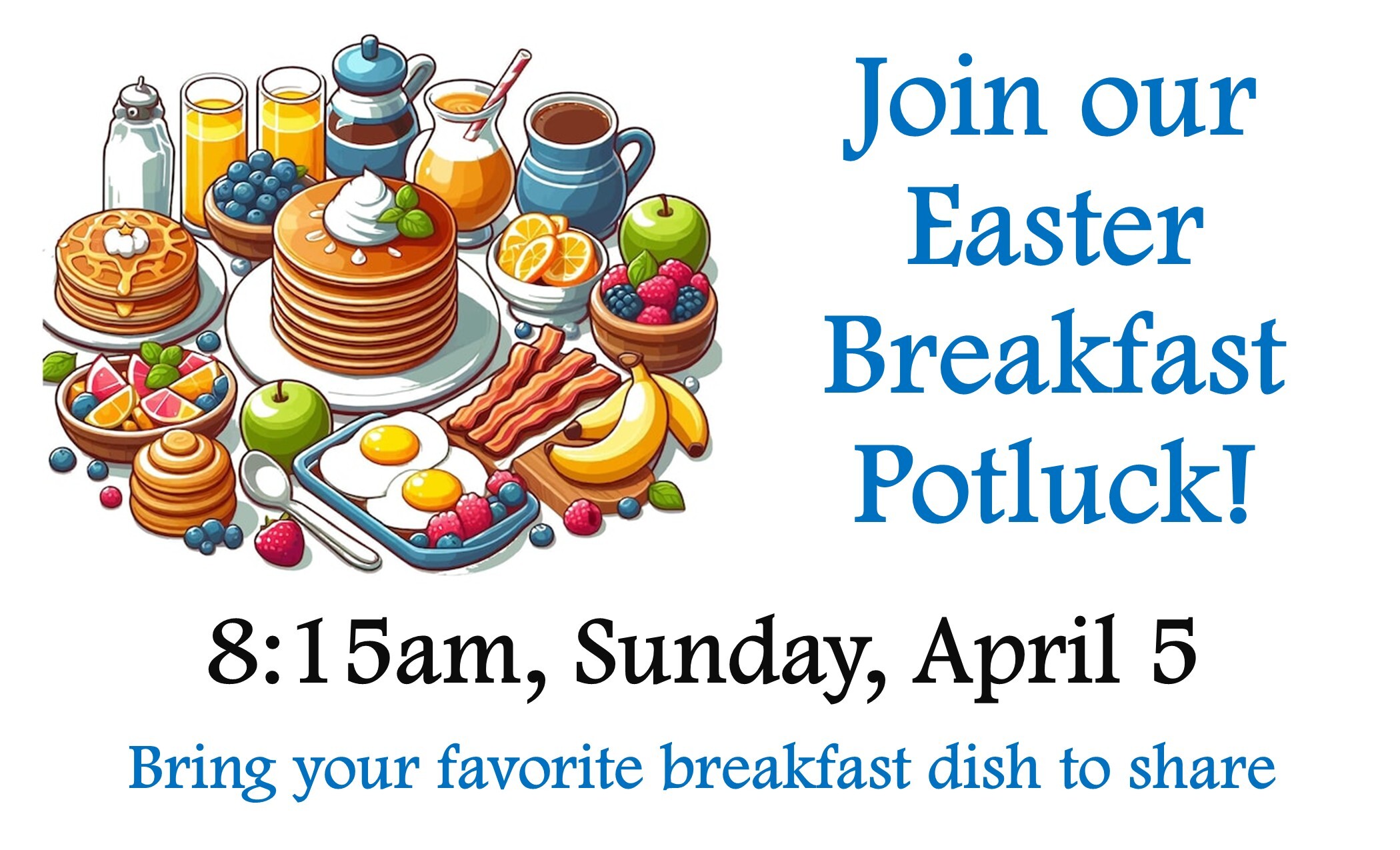 Join us for our Easter Breakfast Potluck after the Garden Service and before Sunday School, Easter Morning, April 5, at 8:15am.